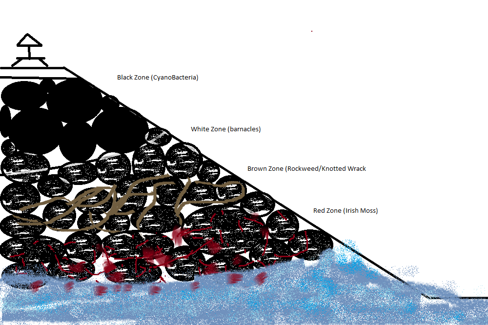 The Red Zone is the most biodiverse zone. During low tides, its the zone with the most tidepools, and low level water wich tends to be filled with small critters and plants. When its high tide, the red zone is the deepest, and still full of life