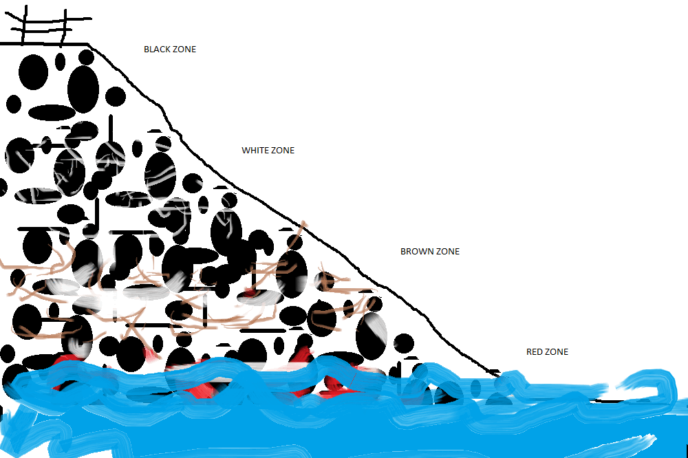 Black Zone: The black zone is called the black zone for one reason, it's black! It is black because it is covered with a substance called cyanobacteria, which is basically black algae. When it is covered, the entire rock turns to the color black, and the substance is hard to get off.