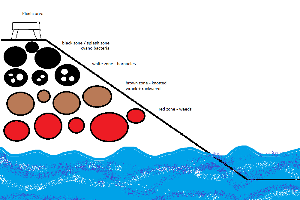 I think there is the most variety in the red zone. It is the zone closest to the water and it has most ocean life living there. I found many diffferent types of seaweed, like knotted rack, rockweed, irish moss, sugar kelp, horsetail kelp, ect. We also found a lot of crabs like, green crabs, rock crabs, Jonah crabs, and hermit crabs all in the red zone.