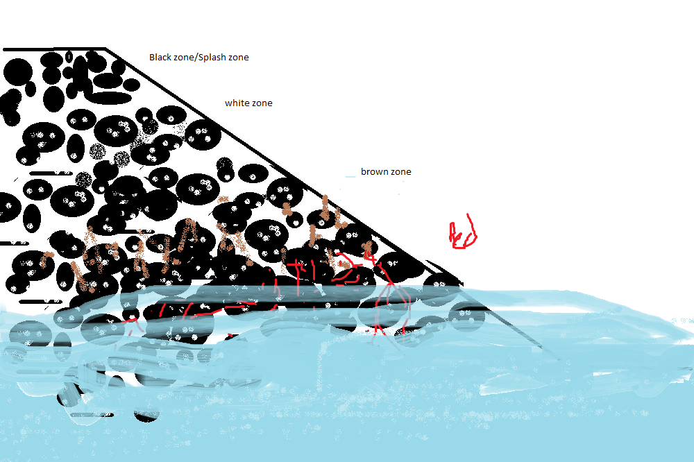 The next zone is the white zone. The white zone is black rocks with white dots. They are black and white dots because of the cyanobacteria and barnacles.