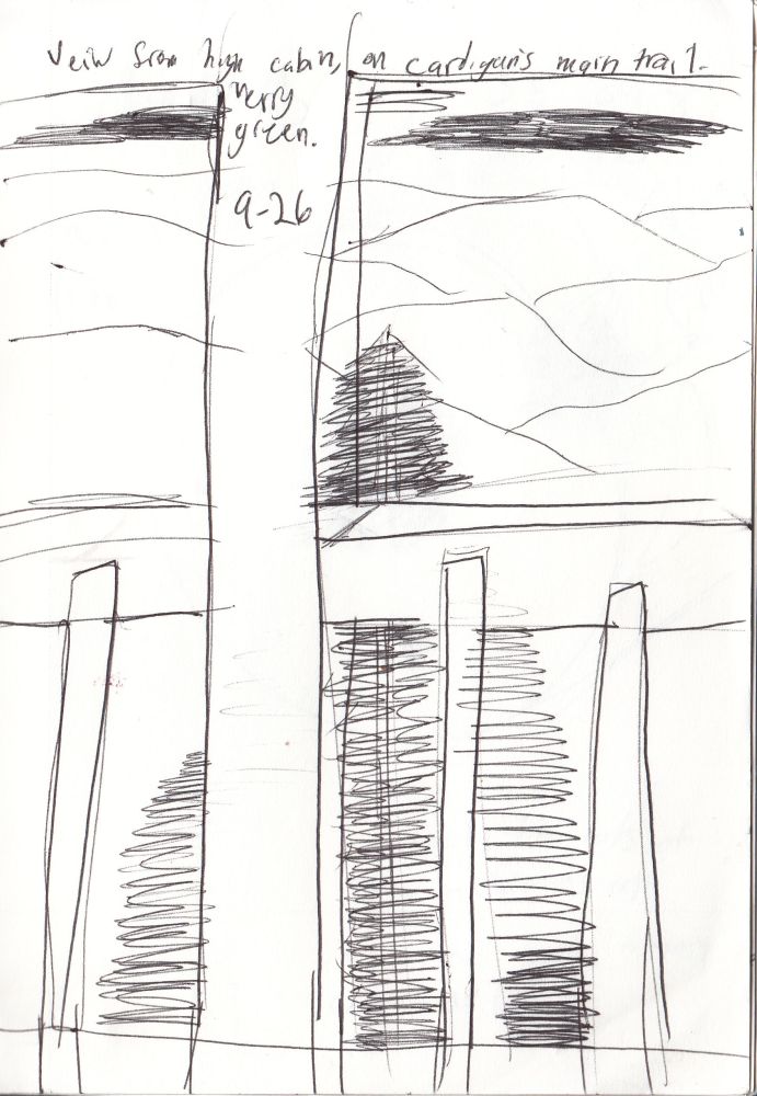 Day Two at Cardigan was spent mainly doing our longest hike of the trip, our main goal. Our group hiked up Vistamont trail, where we saw quite a few views and stopped several times to sketch. While we were there, we ate a snack. After we walked across the ride to Cardigan, on our way learned a couple walking songs and a few games. One of those games was a counting game, where each person could say one number, but you couldn not say the same number at the same time. We made it all the way to 100. While hiking the ridge we learned about the Borrial and Hardwood zones, or the areas where certain trees tend to grow. Once we reached the top of Cardigan, we saw the firetower and ate lunch of ham sandwiches and Welch's fruit gummies. Then the whole group took a picture, and then split up to go down. Our group went down the main Cardigan trail. We saw the warden cabin and then stopped at the High Cabin to sketch and hear a story about how forests grow. We took a lot of GPS waypoints and stopped to sketch every quarter mile. When we returned to the AMC Lodge, we had about an hour of free time before we had dinner, which was Hamburgers, and then we held the reptiles and had a campfire. Our group made a skit about LEAVE NO TRACE, where an animal died because it ate trash. After out bedtime story, about different kinds of birds, we went upstairs to our bunk rooms. It sounded like the boys in the room above were summoning a demon, pounding on the walls and floors until exactly 10:00. Which was lights out. Cardigan was an amazing experience and we had achieved our goal and the purpose of the trip: hiking Cardigan.