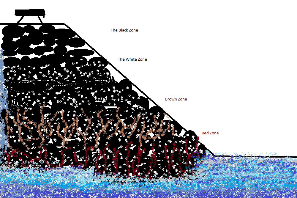 The Red Zone is a zone near the shorelines in the water where it includes a reddish irish moss covering around it, including it being covered with surrounded by water that is covering it. The Red Zone is in the intertidal zone, close to the lower tide zone. It also includes little organisms such as sea stars, cyanobacteria, barnacles, and some perrywinkles, and possibly some sea lace. The Red Zone is also directly right under the Brown Zone, which is the inner layer close to the low tide region near the rocks and in the water.