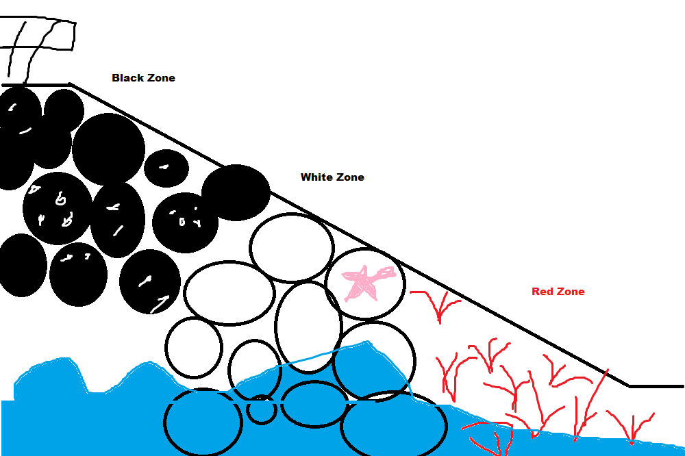 Thye're is a red zone, this is called the red zone because the seaweed is red it is almost always wet and underwater.This zone was really wet and basically was always underwater.