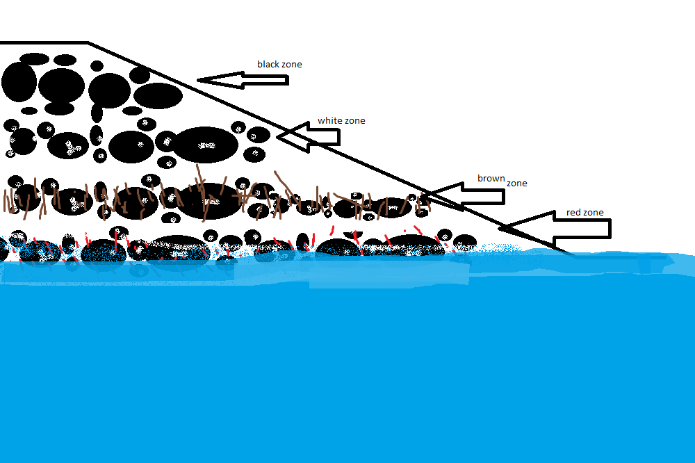 I think the most variety is in the red zone because that is where I found the most amount of stuff, including the drowned forest. I think I found the most amount of stuff here because this is where there is still a lot of water, even during low tide. I found things like crabs, different small things swimming in the water, and there was still a lot of plants like knotted wrack and rockweed.
