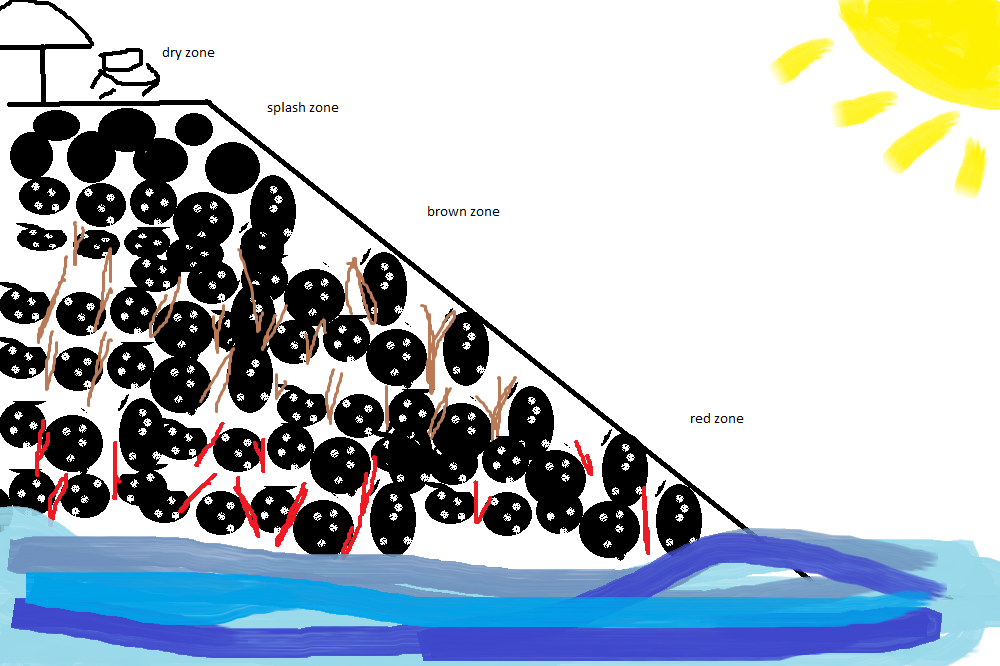 The red zone has the most stuff. The red zone is at the bottom, and has the most animals and plants. It's in the ocean, and there is a strong ecosystem there. Not only does it have the other things that the zones have, like cyanobacteria and barnacles, but it also has its own plants and animals.