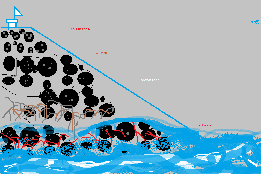 The red zone has water covering the rocks but not all the time because of the high tides and low tides.